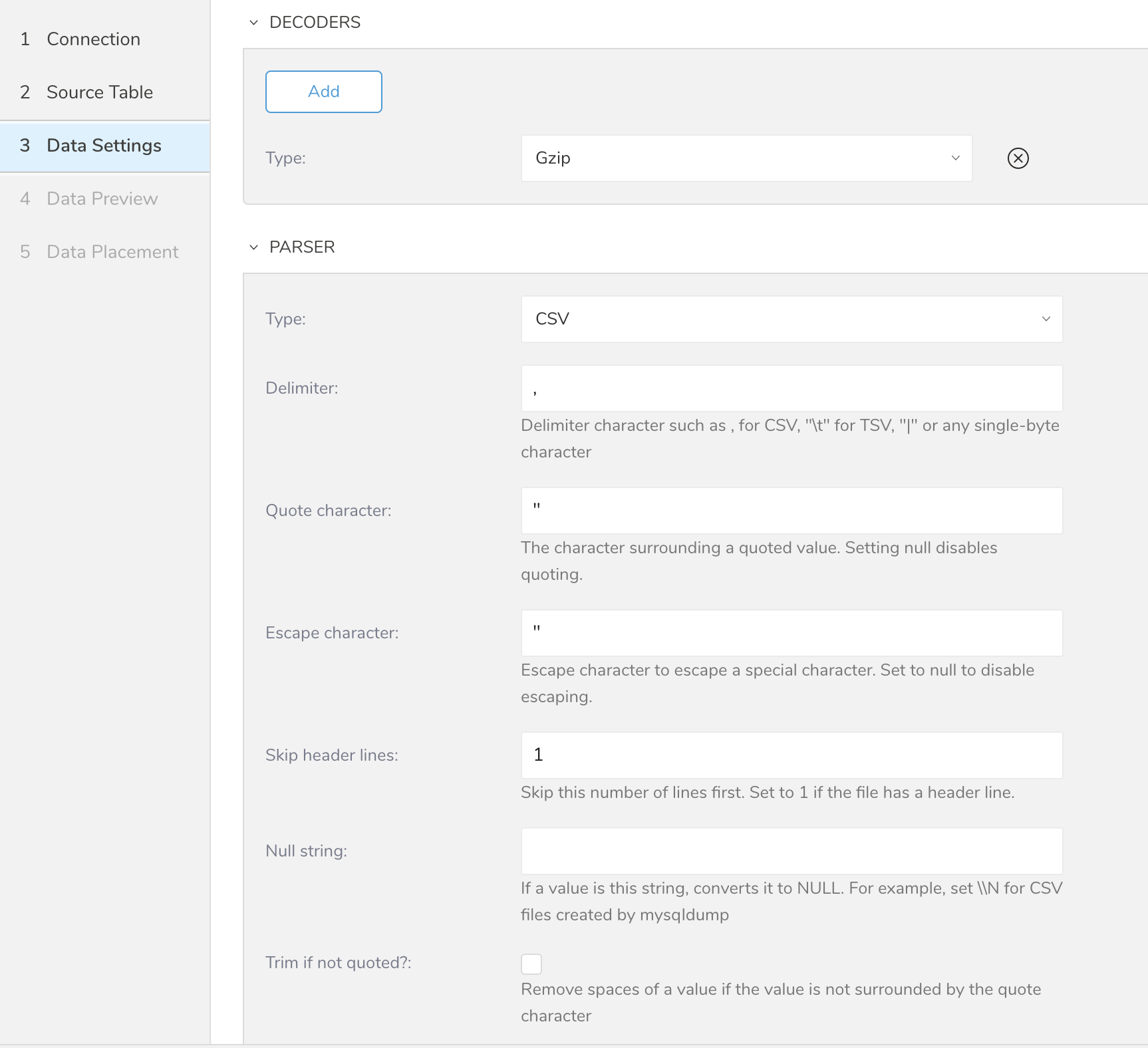 | Type | Following types are supported: - Avro - CSV - json - Query String |