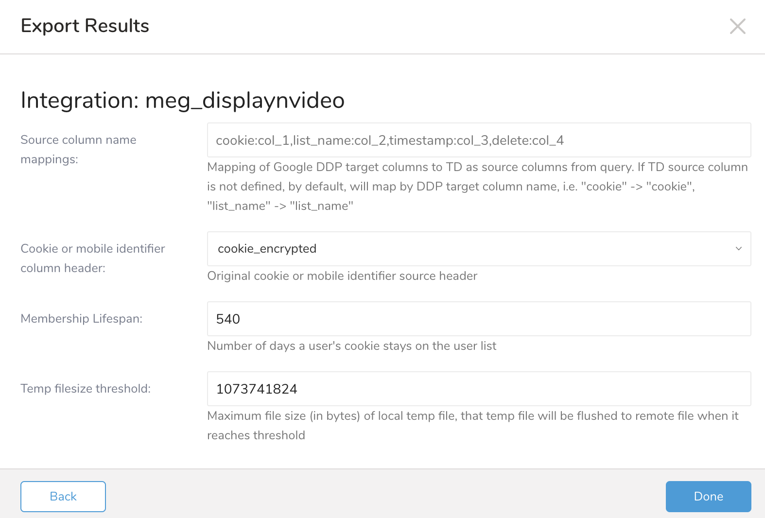 | Source Column Name Mappings (Optional) | Define the mapping between Google DDP column names and the output column names you specify in your query. You select the target column and then the source column. For example, if google_cookie is the identifier column in your TD data source, you should define the mapping as a cookie:google_cookie. If the source column in the mapping is missing, the target column name will be used. For example, a cookie is the same as a cookie: cookie mapping. |