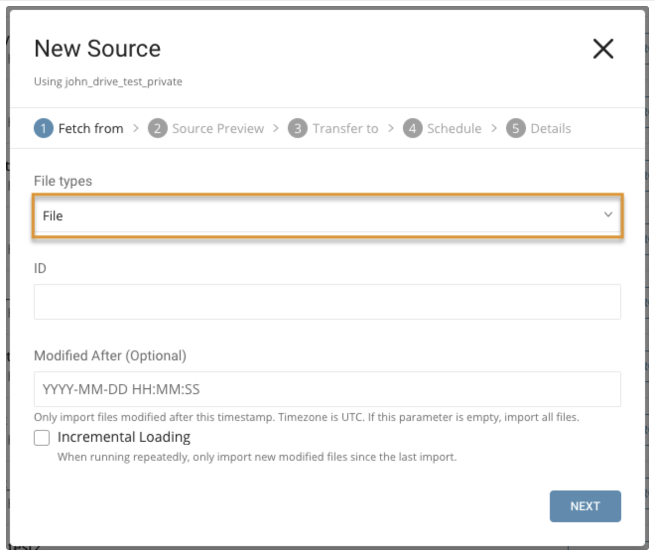 incrementalThis configuration is used to control the load mode, which governs how the data connector fetches data from Google Drive based on last modified time of File or Files in Folder.- last_modified_time This configuration is used to control the last modified time of files from the previous load job.