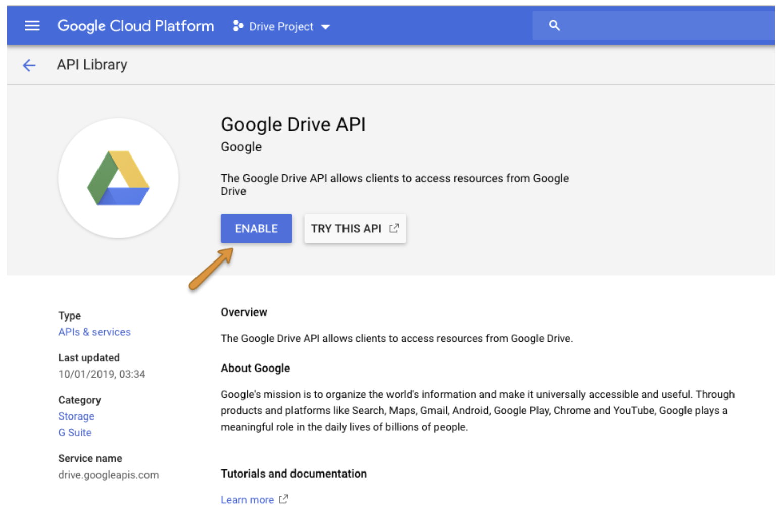 Choose Google Drive API and select Enable.