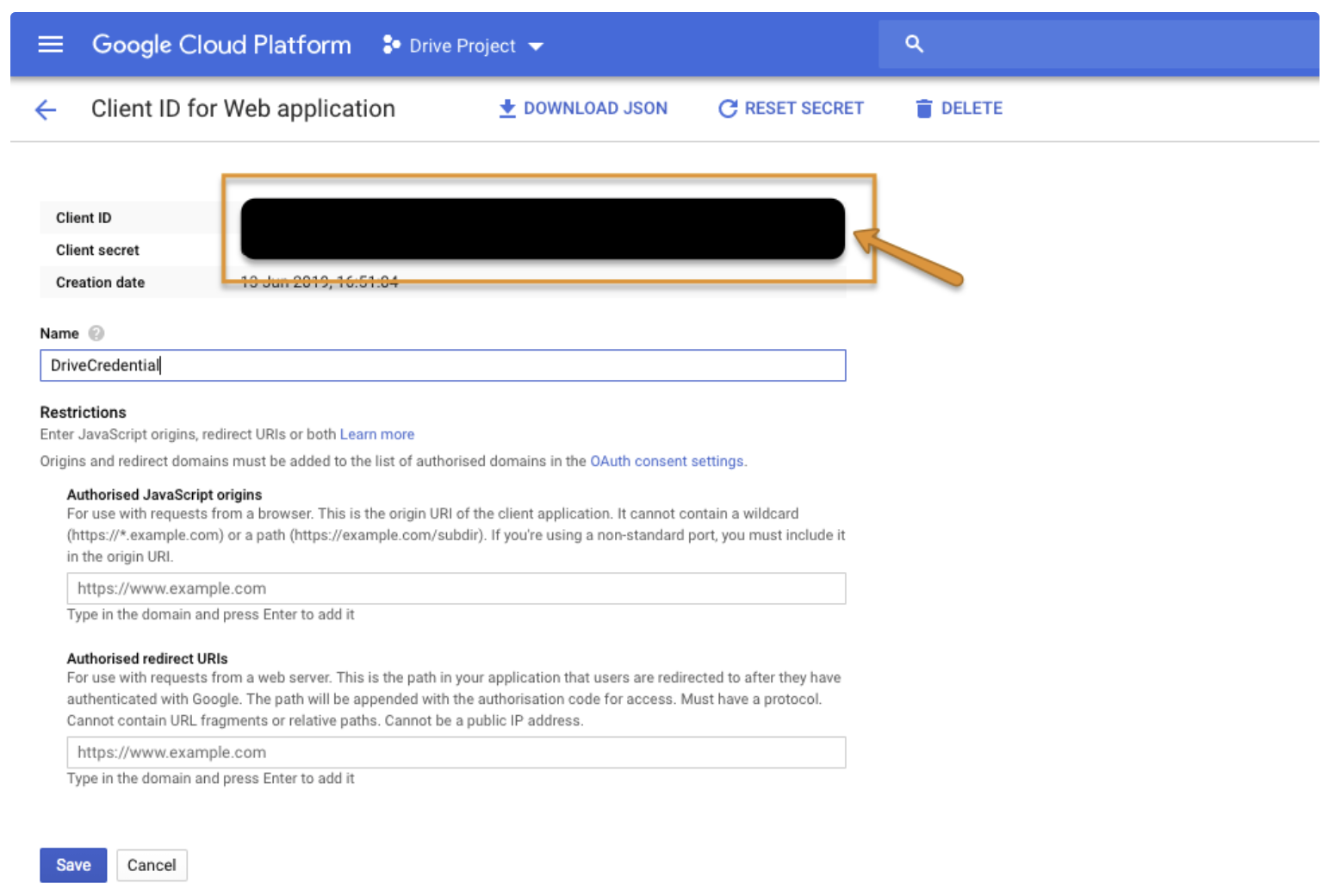 Go to the OAuth consent screentab, provide the Application name, then select Add scope to add the /auth/drive scope then Save.