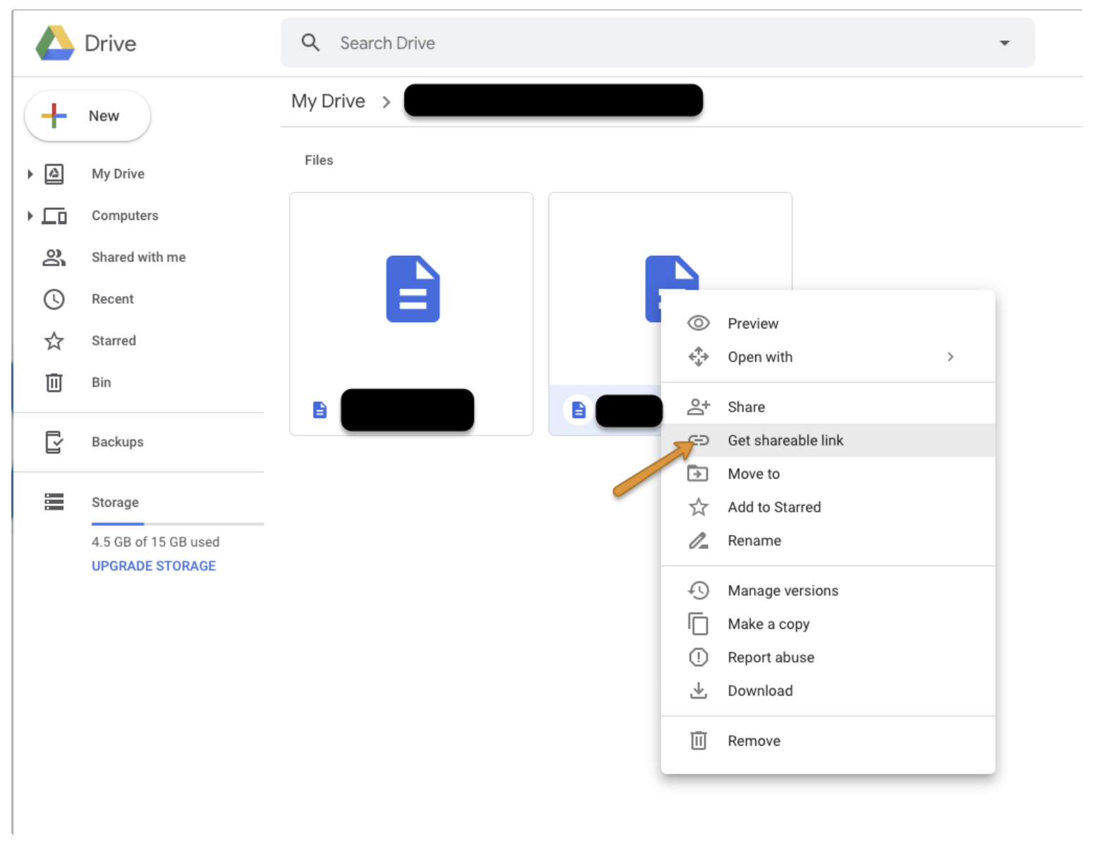 From your drive, choose a file and then right-click and select "Get shareable link".