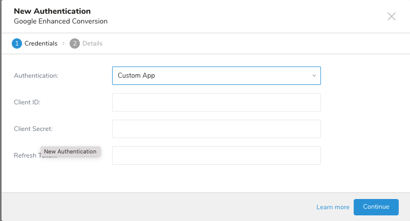 There are two ways to connect to Google Enhanced Conversion Export Integration. You can authorize the Treasure Data Google OAuth app or provide your Custom App information. |