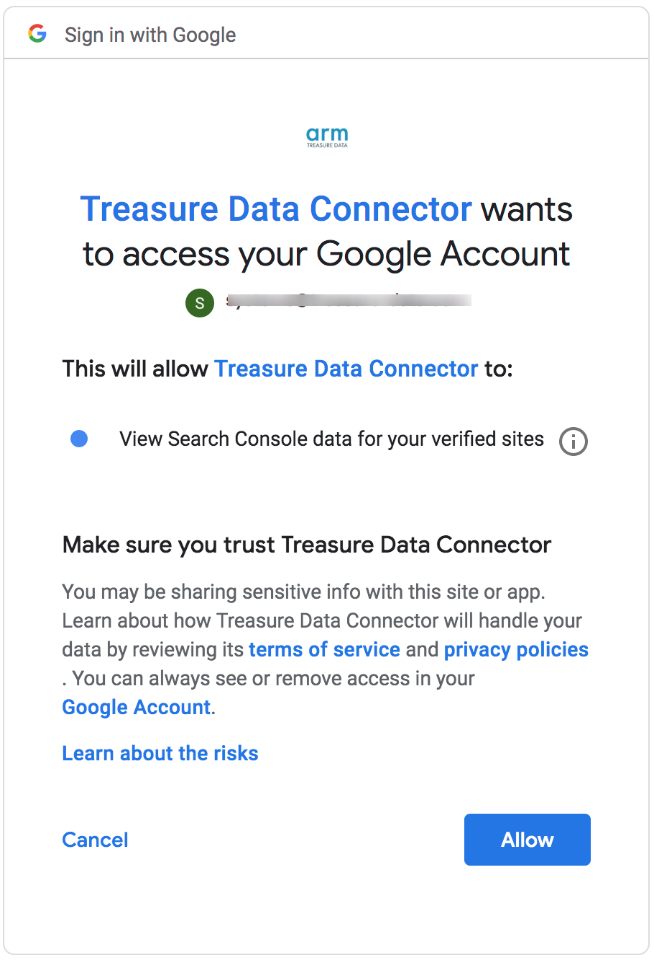 Log into your Google account, in the popup window and grant access to the Treasure Data Connector app.