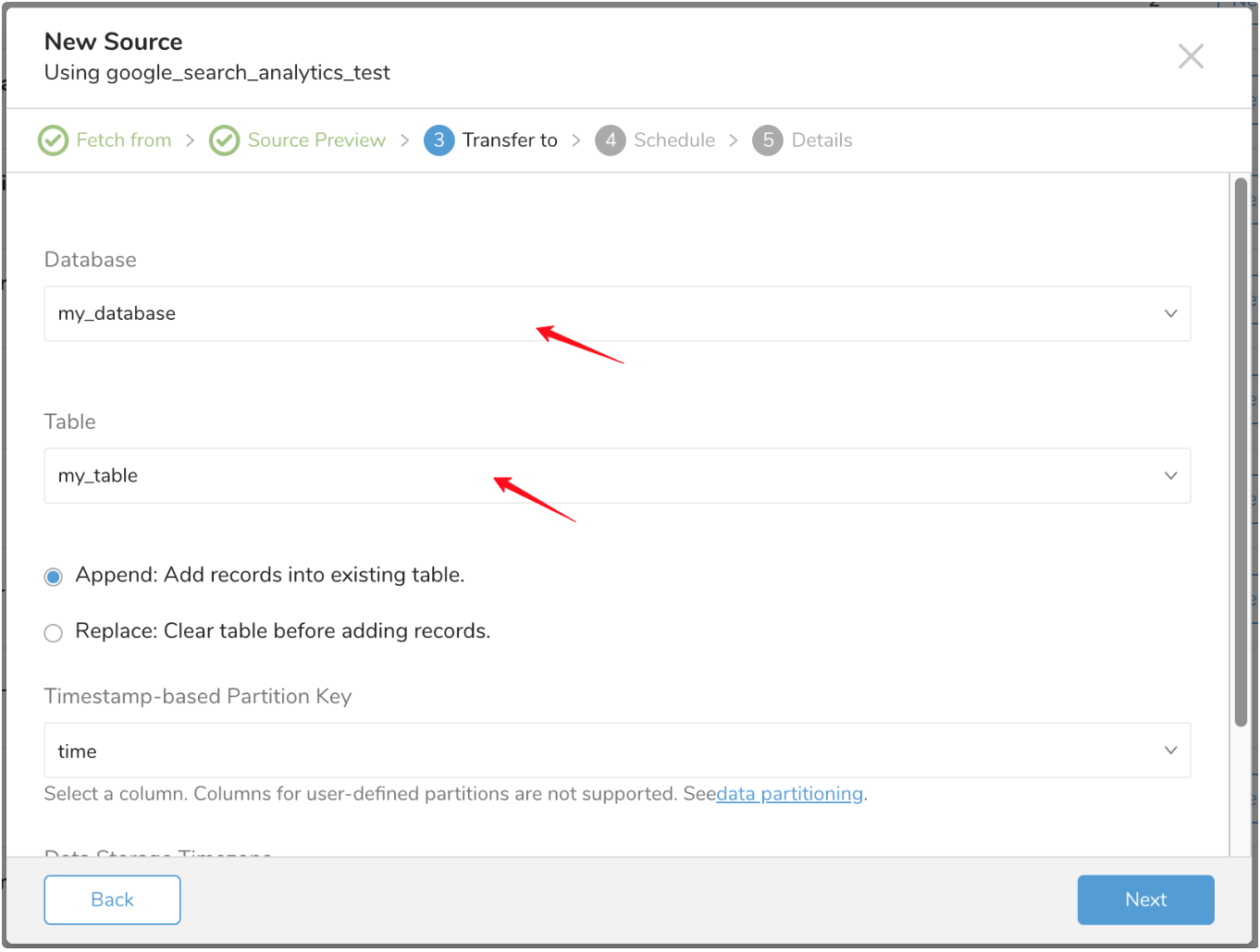 Select whether to append records to an existing table or replace your existing table.