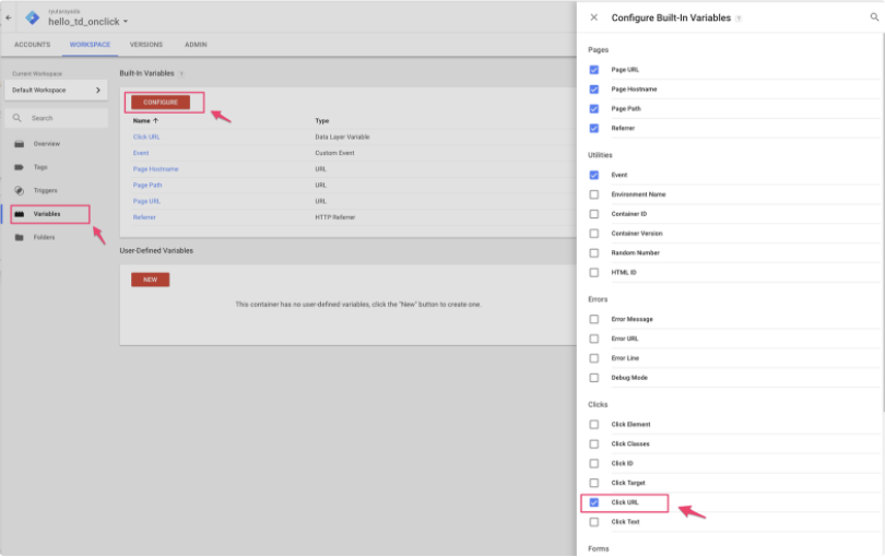 You can track links users click by setting the Click Trigger, which sends an additional JavaScript tag with your data and the {{Click URL}} variable to Treasure Data. The {{Click URL}} variable contains the URL information of the link. You can use the Click Trigger to track when users have clicked links to external sites on which you cannot track page-view. Google Tag Manager variables make your tracking more adaptable. They are like containers that hold changing values, so you are able to take information for your website's context and pass it to your tags, making your tracking and analytics setup more customizable.