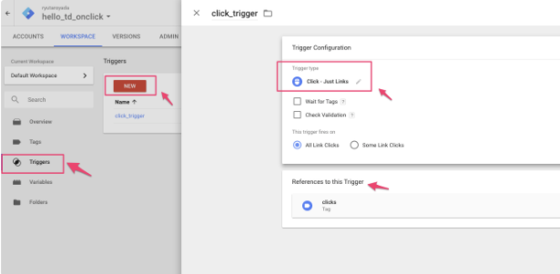 - In the Trigger Configuration Panel, select Click - Just Links. The Clicks tag is selected under References to this Trigger, so that any references to the trigger fire.