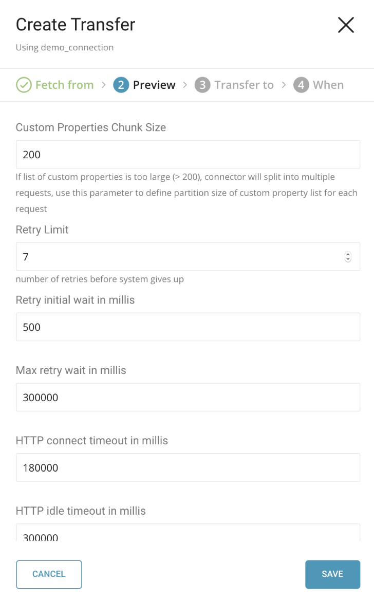 retry_limit: maximum retry times, Default: 7max_retry_wait_msec: maximum retry waiting time in milliseconds, Default:30000from_date: import data from this date, the format is: YYYY-MM-DD. This is required for contacts, companies, deals, and email_events.fetch_days: number of days to import data. Default: 1. This is required for contacts, companies, deals and email_events.incremental: determines whether data import is continual or one time. Default: false (not incremental)- connect_timeout_millis: The maximum time, in milliseconds, a connection can take to connect to destinations. Default: 60000.