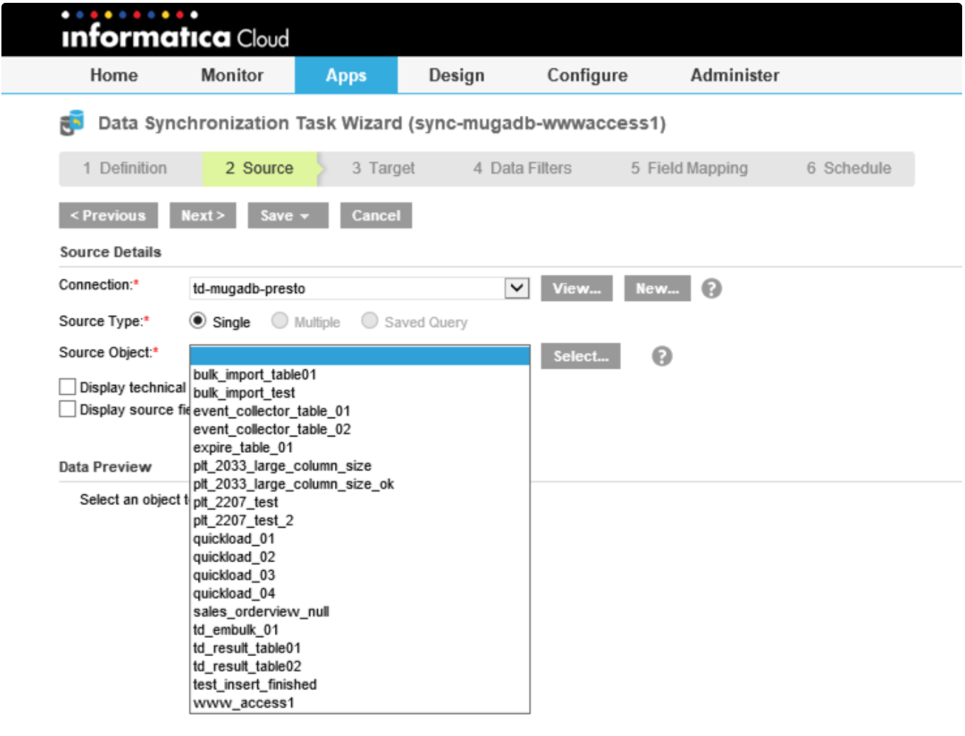 Select the connection established in the previous steps. Then Informatica Cloud shows a list of tables under your database as ‘Source’ objects.