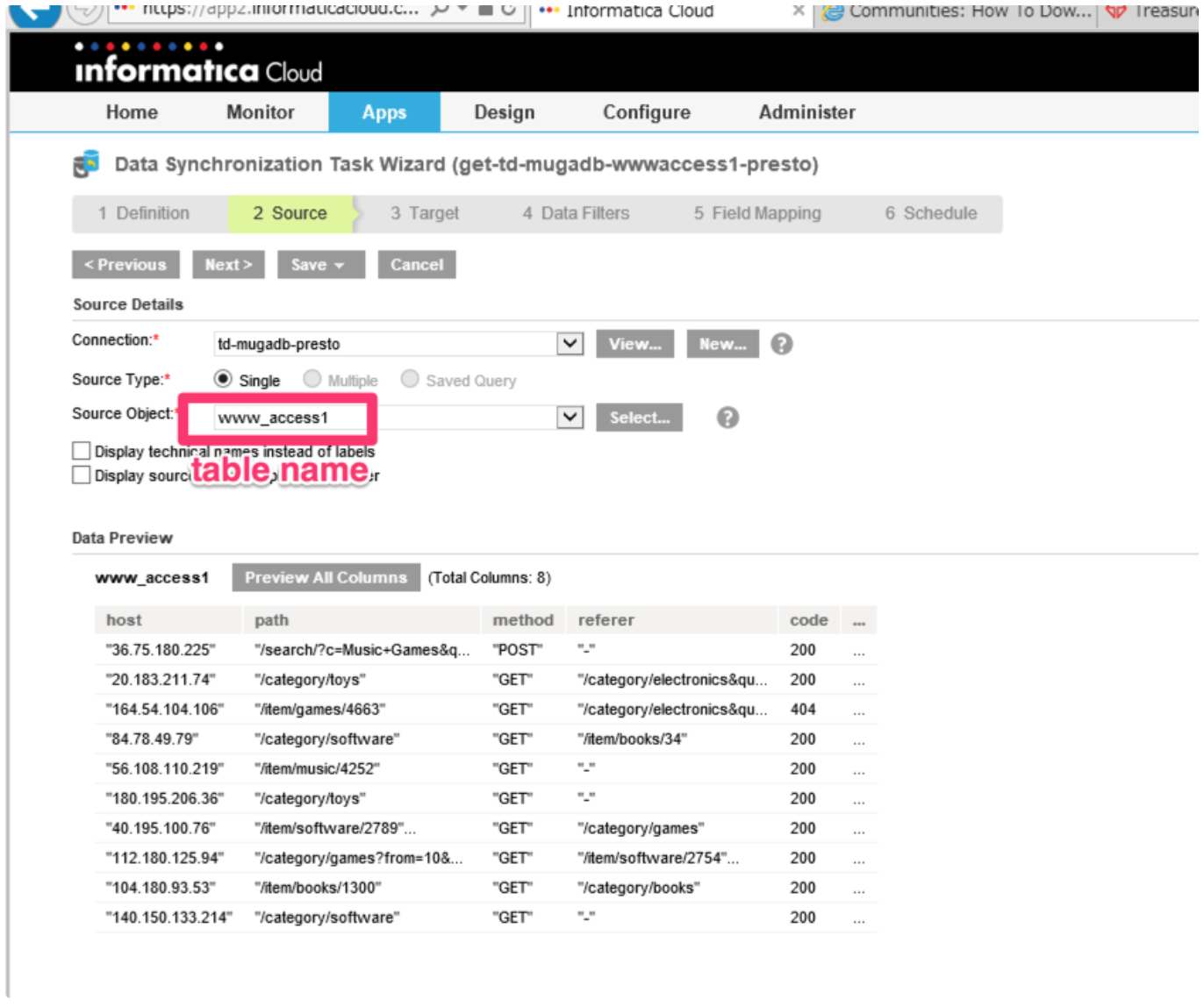 Establish a connection so that Informatica Cloud can extract data from Treasure Data. You are setting up Treasure Data as a ‘Source’ through our JDBC driver.