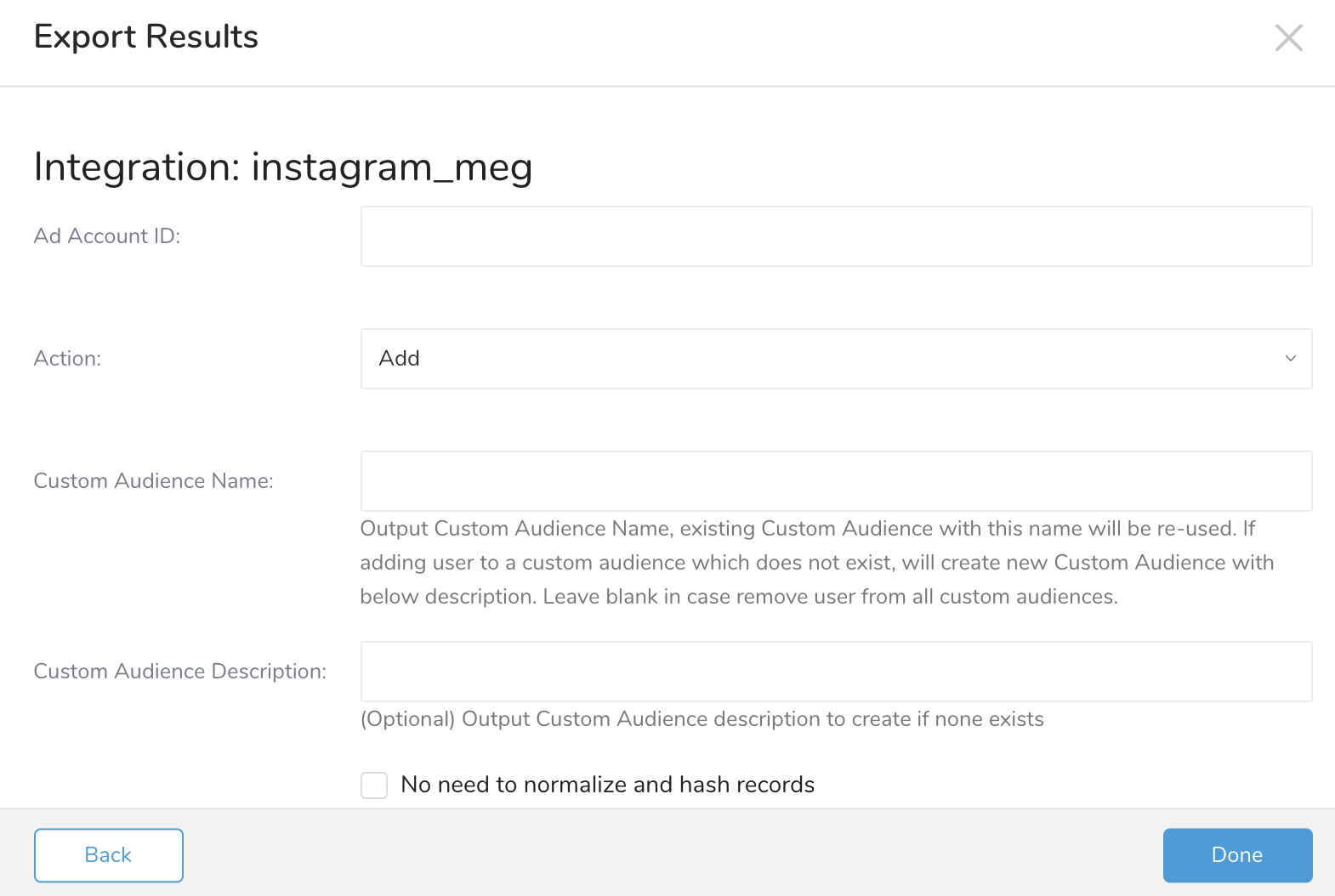 | Action | Add Remove Replace | - Add: Add records to Custom Audience - Remove: remove records from Custom Audience - Replace: replace records in Custom Audience. A limit of one job replacing a custom audience can be in process at any time. After the job finishes on the TD side, it takes some additional time on the Instagram side. During that time other users can't replace that custom audience. |