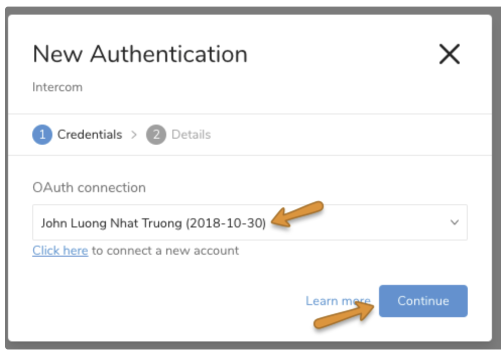 After you grant access to Treasure Data you are redirected back to TD Console. Choose the Intercom connector again, then choose the OAuth Authenticate method. You will see an OAuth connection with your account name in the dropdown list. Choose the account you want to use and then proceed to create the connection.