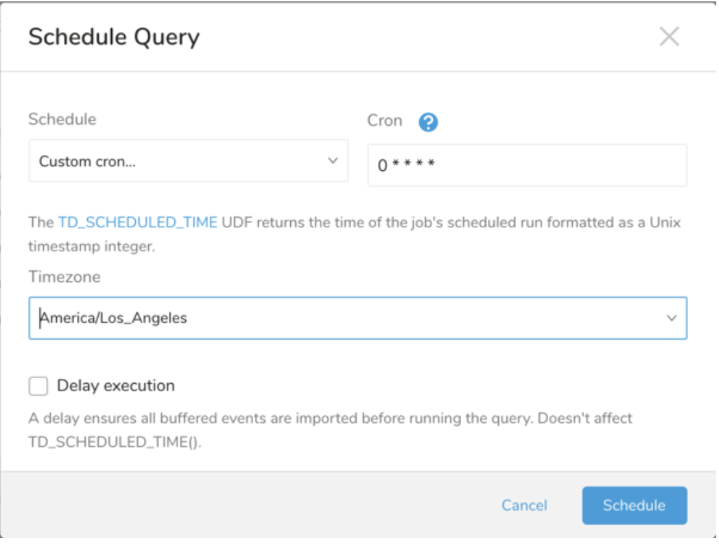 Drop-down Value Description Custom cron... Review Custom cron... details. @daily (midnight) Run once a day at midnight (00:00 am) in the specified time zone. @hourly (:00) Run every hour at 00 minutes. None No schedule.
