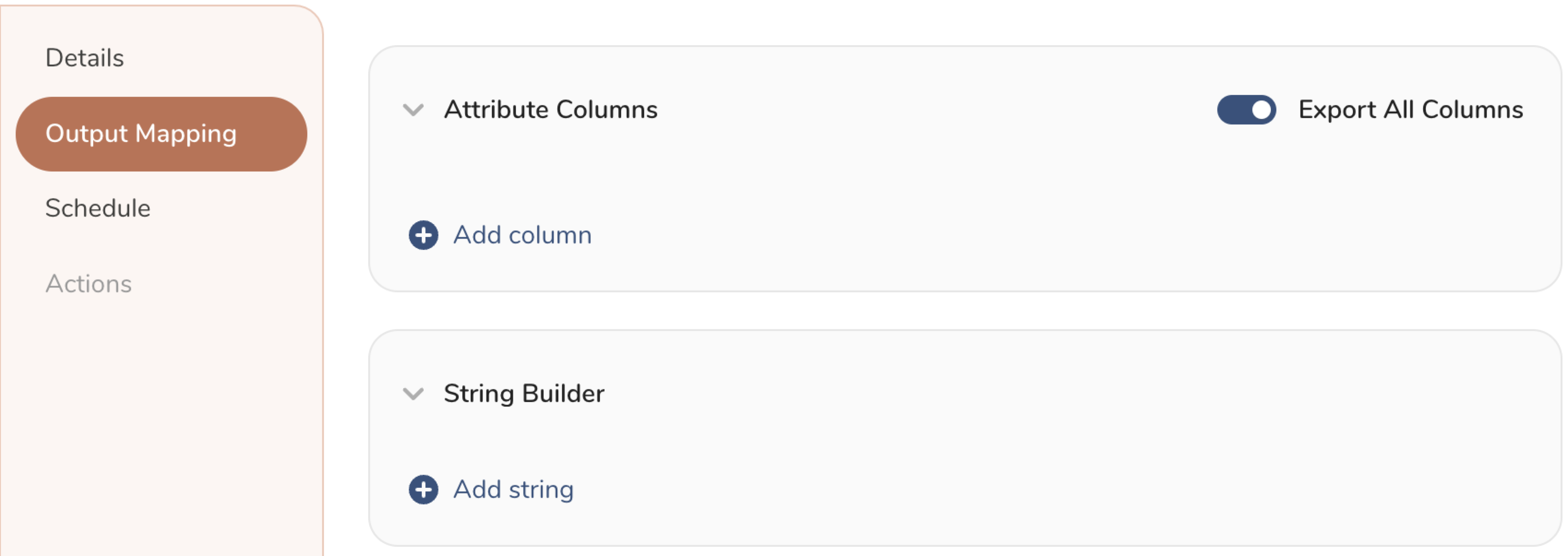 - Select + Add Columns to add specific columns for the export. The Output Column Name pre-populates with the same Source column name. You can update the Output Column Name. Continue to select + Add Columnsto add new columns for your activation output.