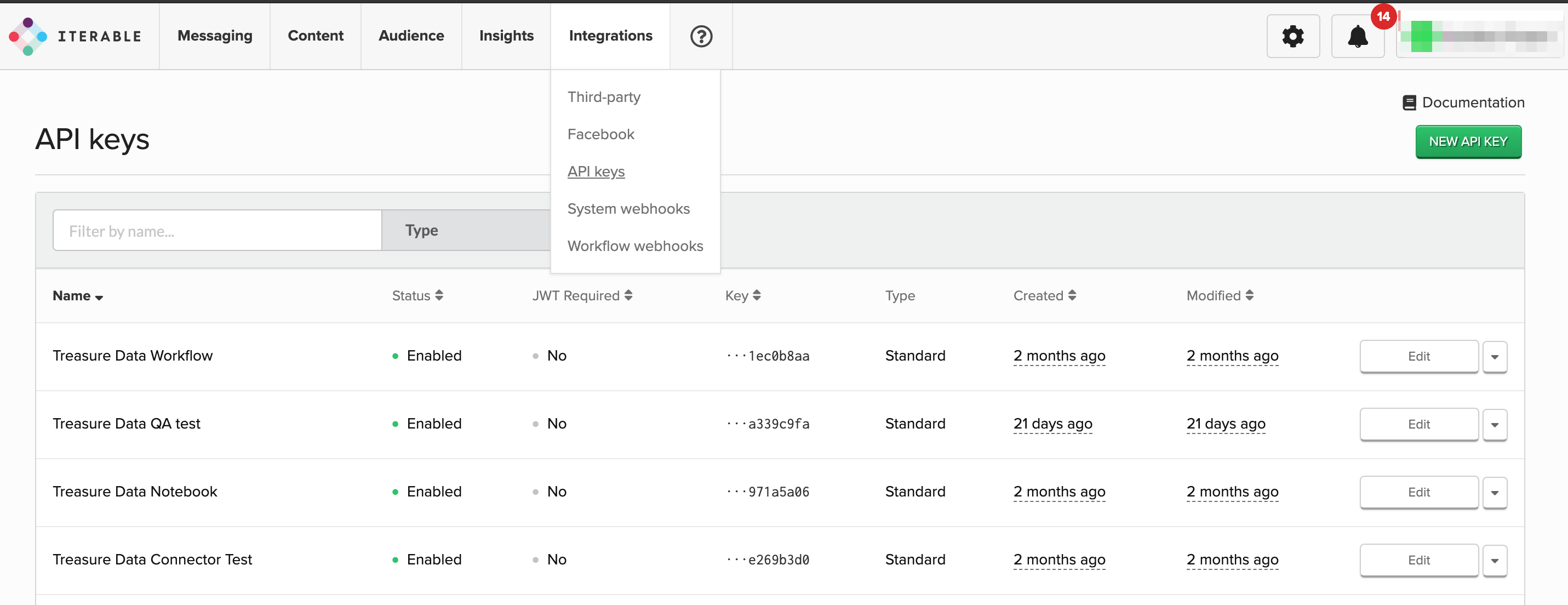 - If using the EU instance of Iterable, navigate to https://app.iterable.com/settings/apiKeys or https://app.eu.iterable.com/settings/apiKeys