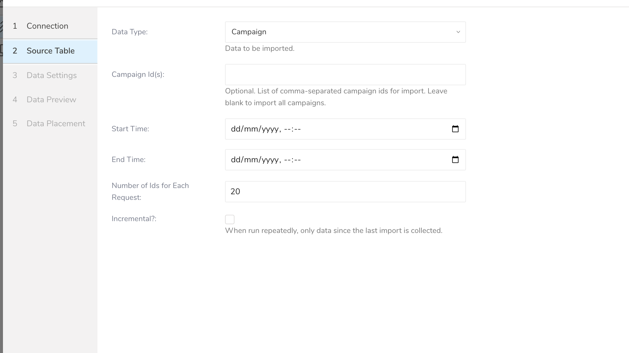 | campaign_ids | Commas separate an array of the campaign's ID. Please leave it blank to import all campaigns. | String | No | |