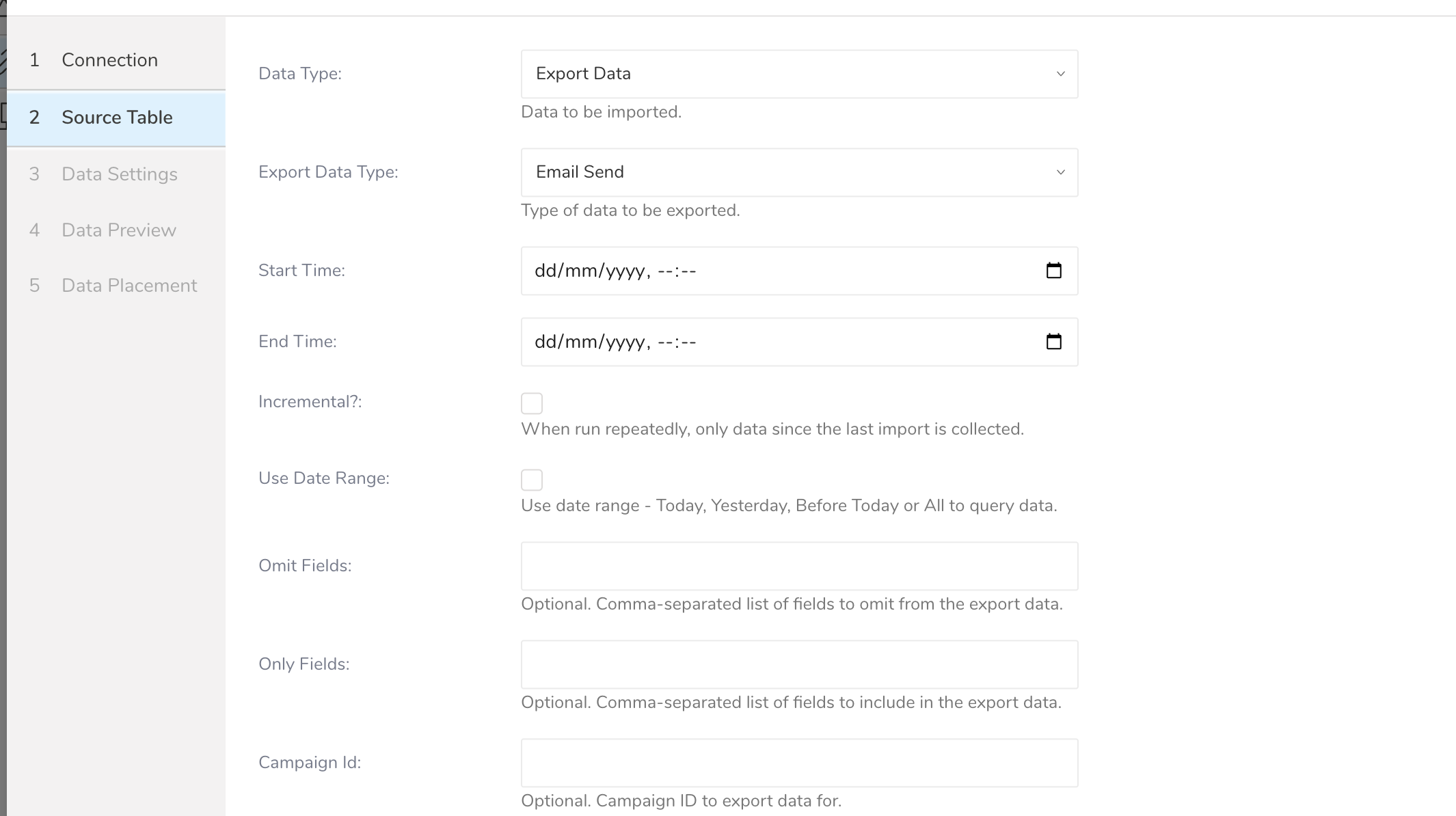 | Campaign Id (Optional) | Filters data to a specific campaign when exporting campaign-related events (e.g., emailSend). Useful to narrow the scope of data. |