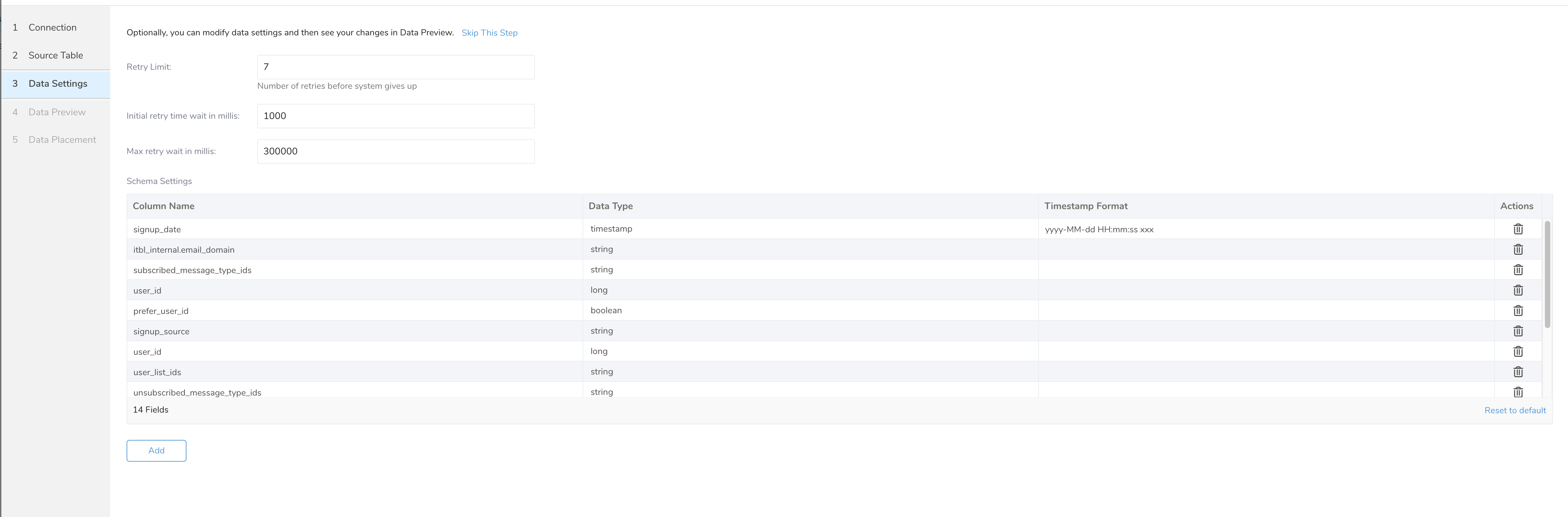 | Schema Settings | The schema was guessed from the sample data. Can modify the type and format before PREVIEW and RUN. |