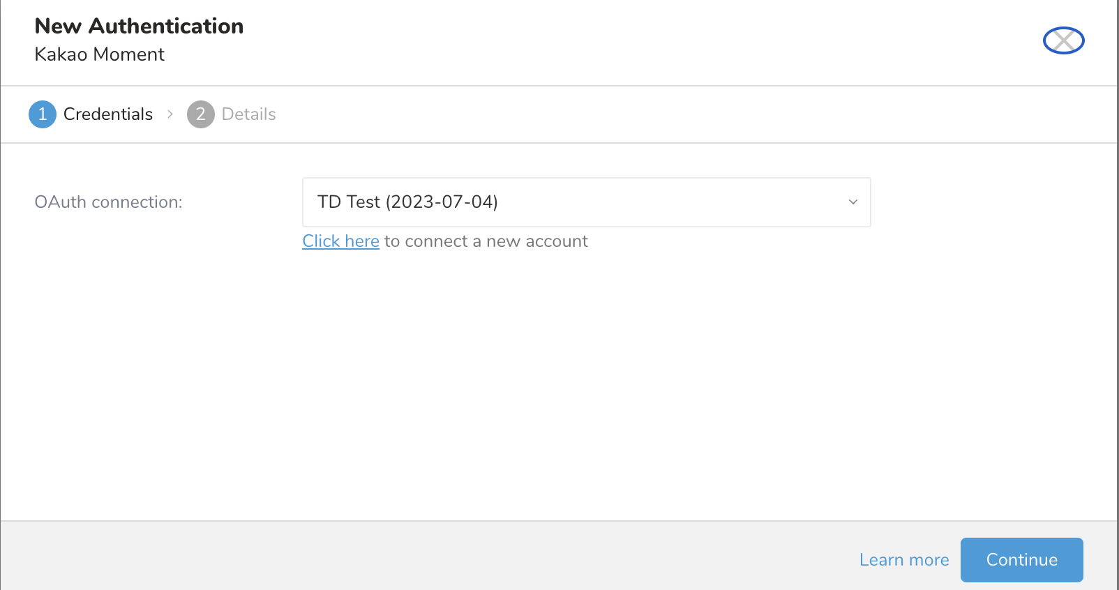 Select the Click here link in New Authentication to connect to a new Kakao Moment Account.