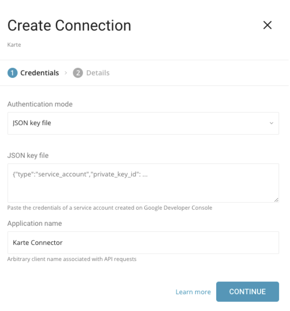 - JSON key file: Copy and paste the contents of the JSON key file generated from the Google Developers Console into this field.