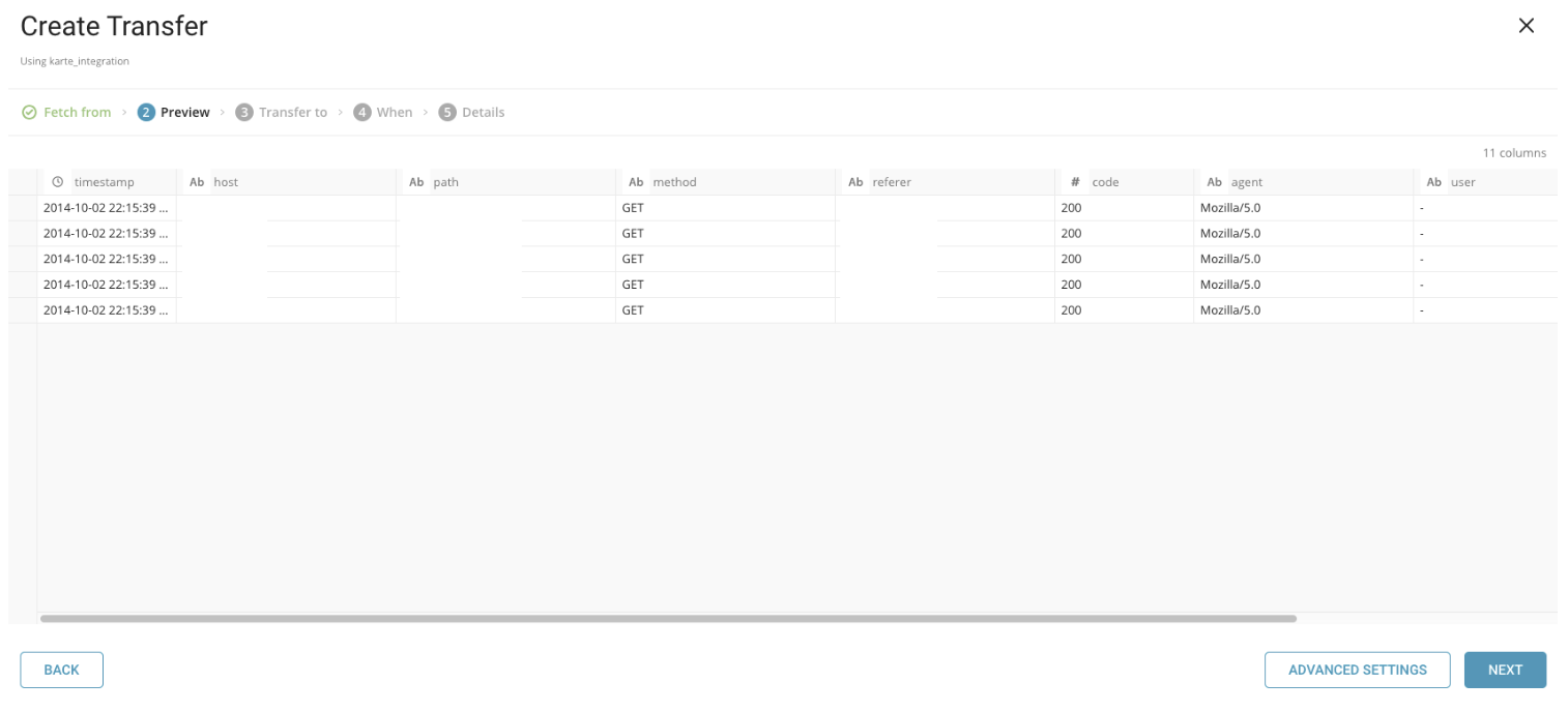 You’ll see a preview of your data. For more information on how data preview works, review About Data Preview. To make changes, such as set specified column name, select Advanced Settings otherwise, select Next.