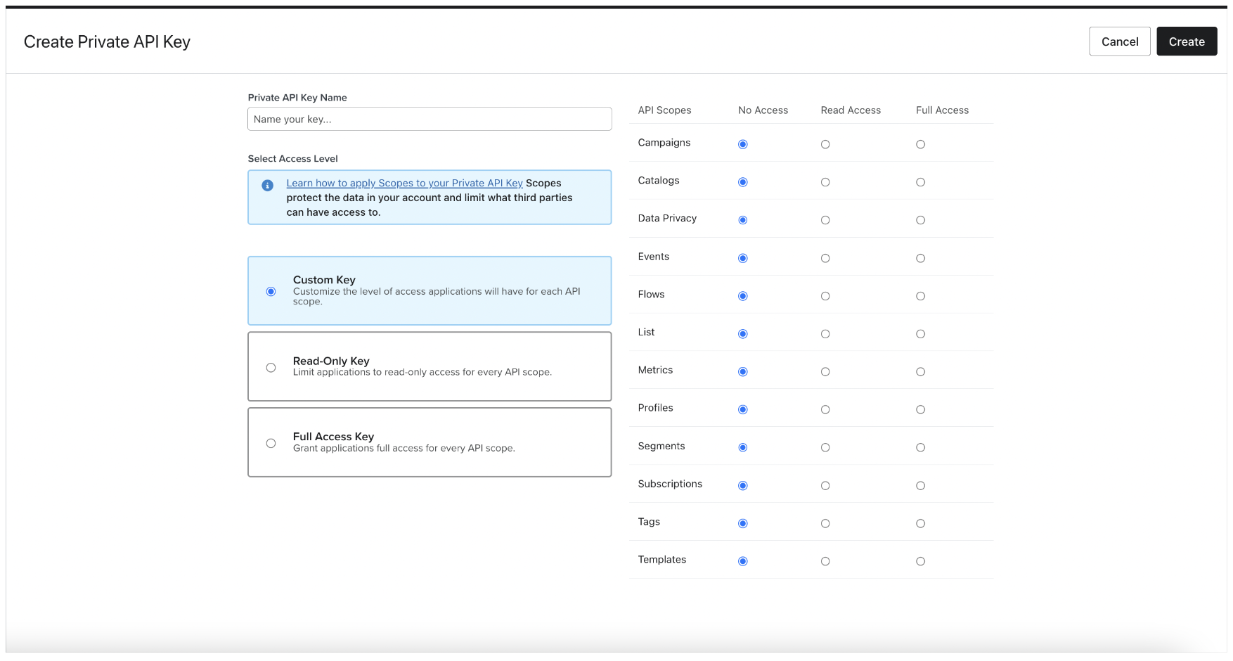 - Enter the API Key name and select access scopes for your API Key.