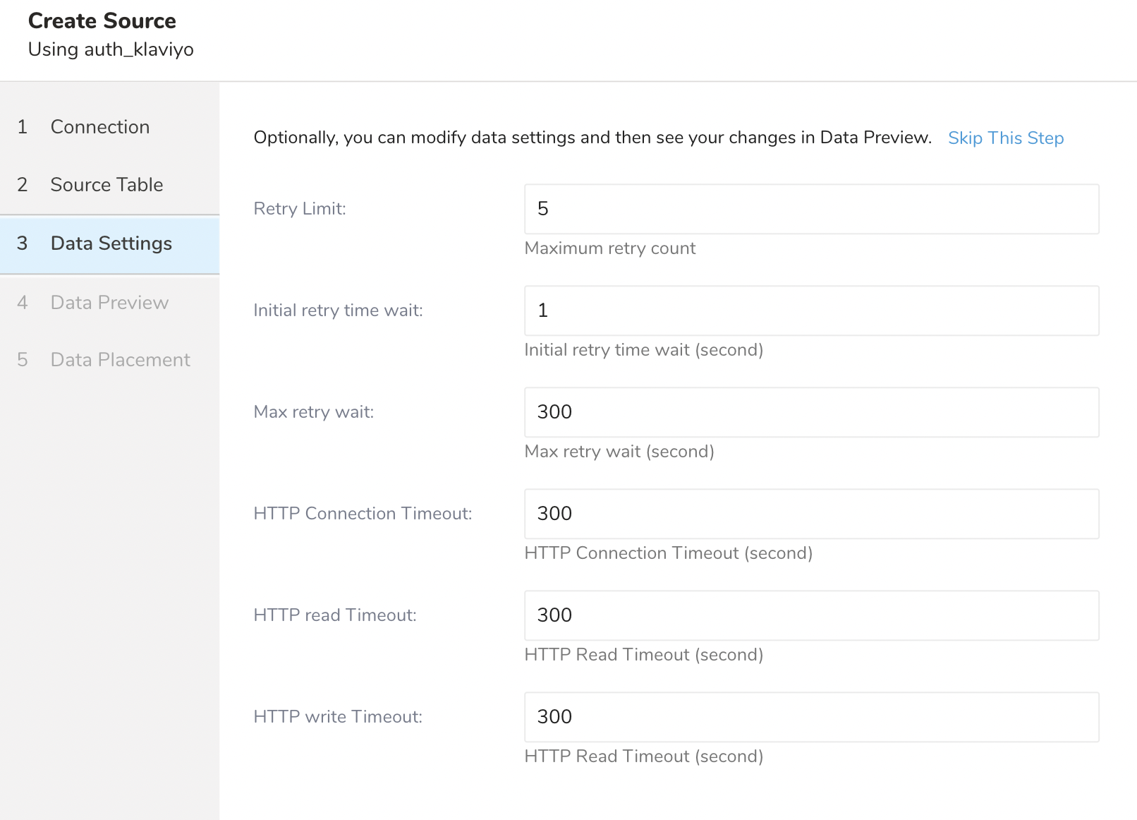| Max retry wait | Number | No | 300 | Max retry interval per API call (second). Min: 30, Max: 1800 |