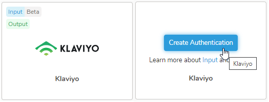 - Search for Klaviyo in the Catalog; hover your mouse over the icon and select Create Authentication.