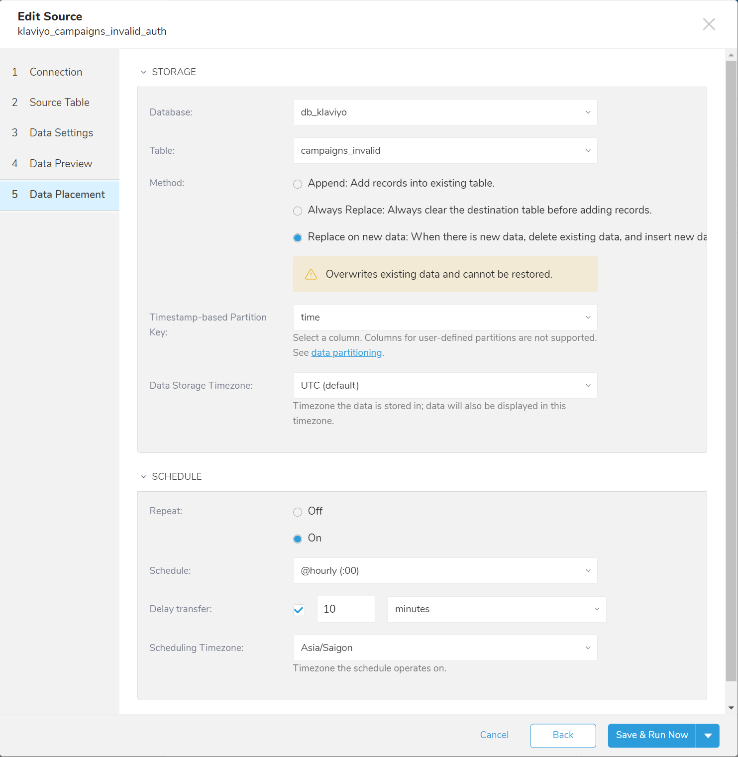 +-----------+-----------------------+-------------------------+-------------------------+You can schedule periodic data connector execution for periodic Klaviyo import. By using this feature, you no longer need a cron daemon on your local data center.