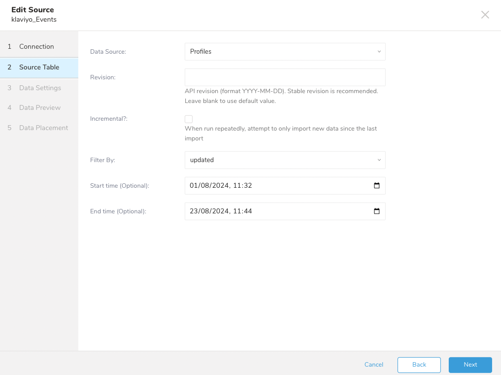 | Start Time - End Time | No | Request data from Klaviyo for this period. Format: ISO 8601 format (yyyy-MM-dd'T'HH:mm:ss) |