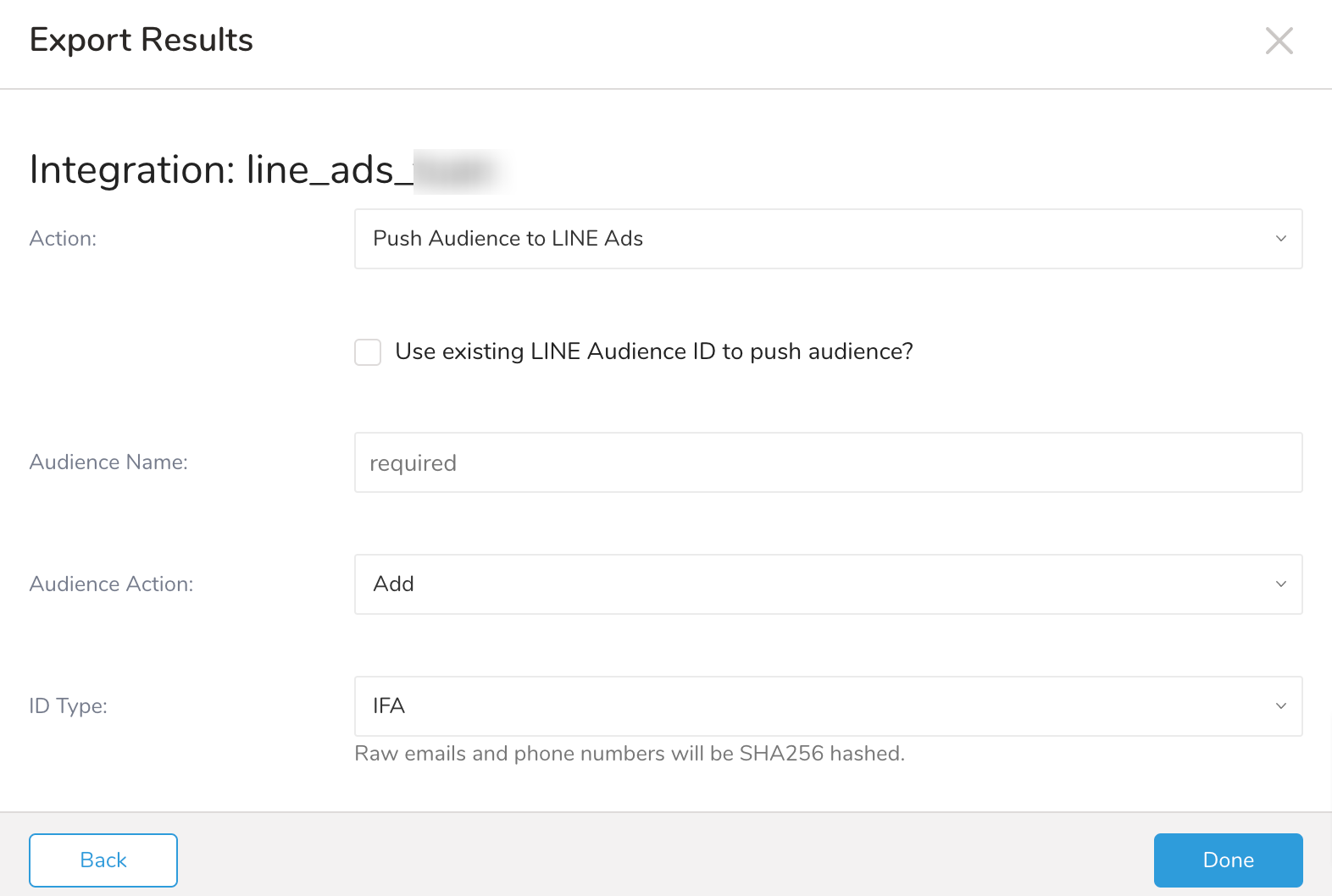 | Use existing LINE Audience ID to push audience? | Use the existing LINE Audience ID instead of Audience Name. |