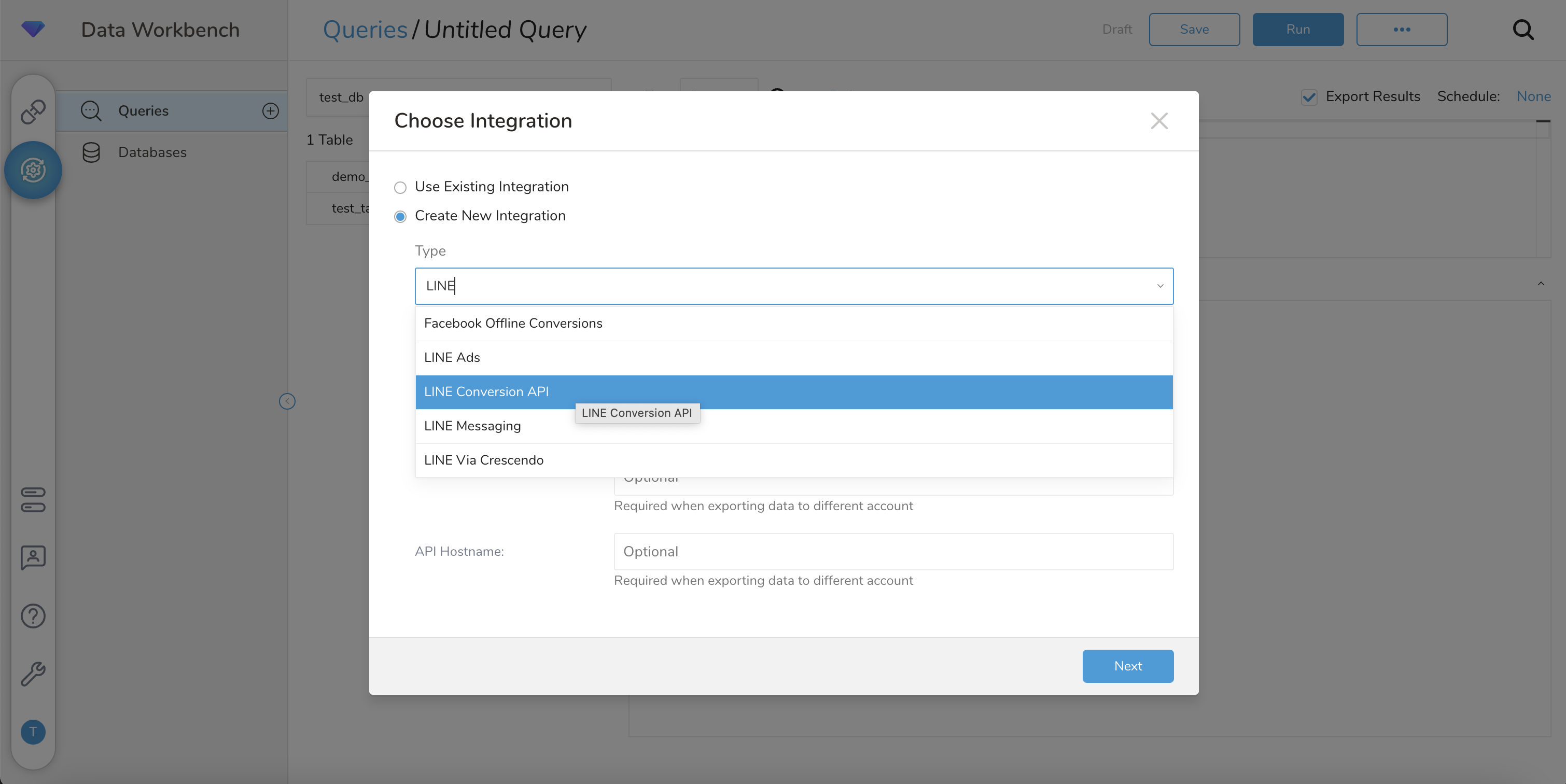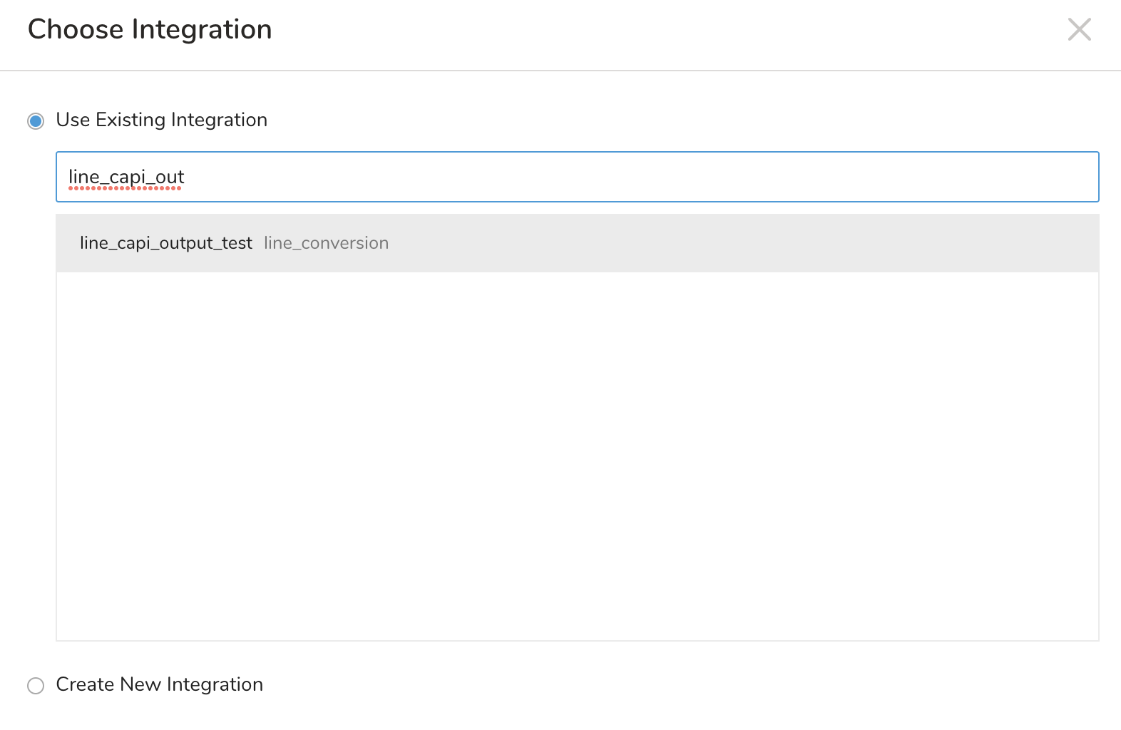 - Select the existing integration you want to use. This example uses line_capi_output_test.