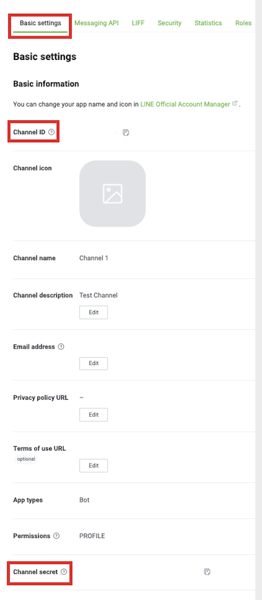 You will see Channel ID and Channel secret on this tab.
