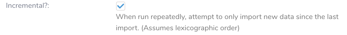 Incremental loading is available for many of the Treasure Data integrations. In some cases, it is a simple checkbox choice; in others, after you select incremental loading, you are provided with other fields that must be specified.
