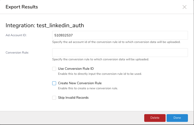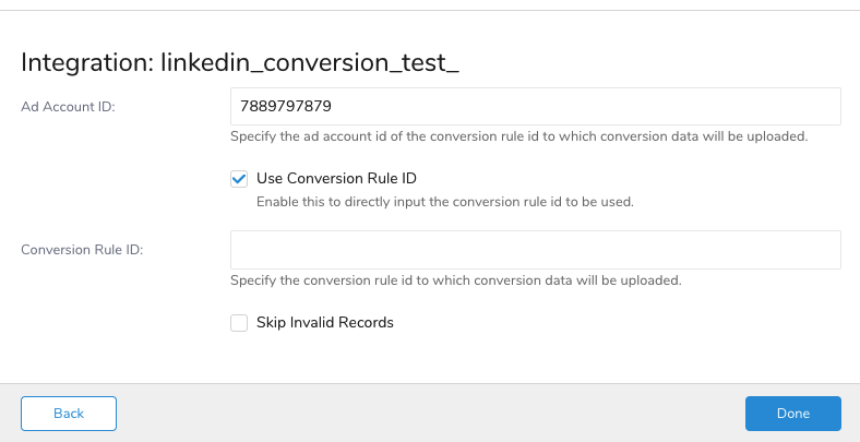 | Conversion Rule | A input field to for specifying an existing conversion rule from your LinkedIn Ad Account. This field is only available when neither “Use Conversion Rule ID” nor “Create New Conversion Rule” options are selected. |