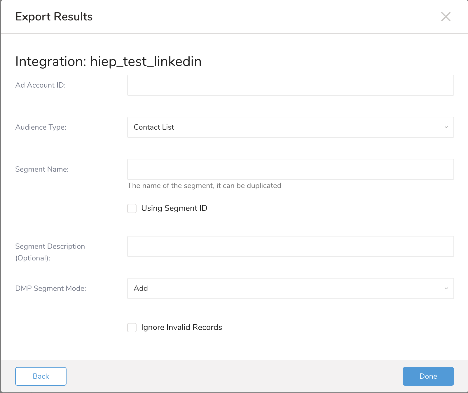 You can export job results from Treasure Data directly to LinkedIn. You can use this export data connector to create Data Management Platform (DMP) Segments, and upload or update Audience Lists dynamically to your Matched Audiences. The LinkedIn Export Connector supports the following features: