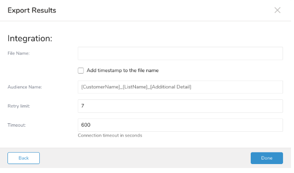 - Connection timeout in seconds: the amount of time allotted for connecting to the Liveramp SFTP Server (default: 600)