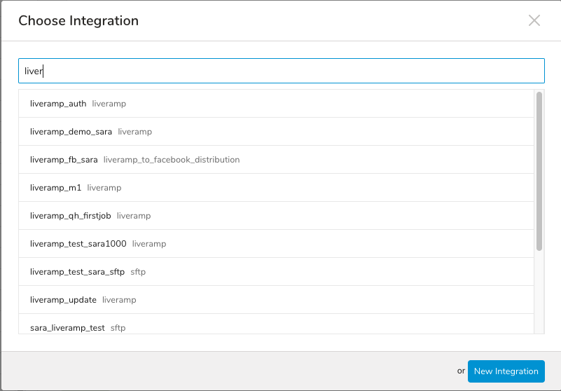 The Choose Integration dialog opens. Select an existing LiveRamp connection. If you do not have an Integration already set up, see "Creating a New Connection During Data Export".