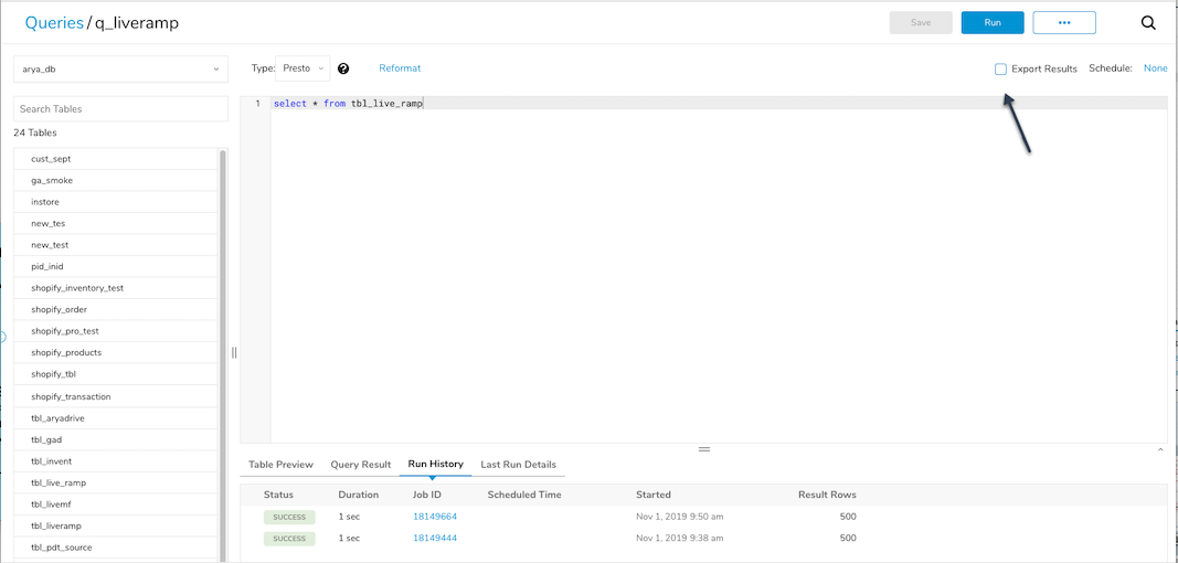 Save the query with a name and run, or just run the query. Upon successful completion of the query, the query result is automatically exported to the specified destination.