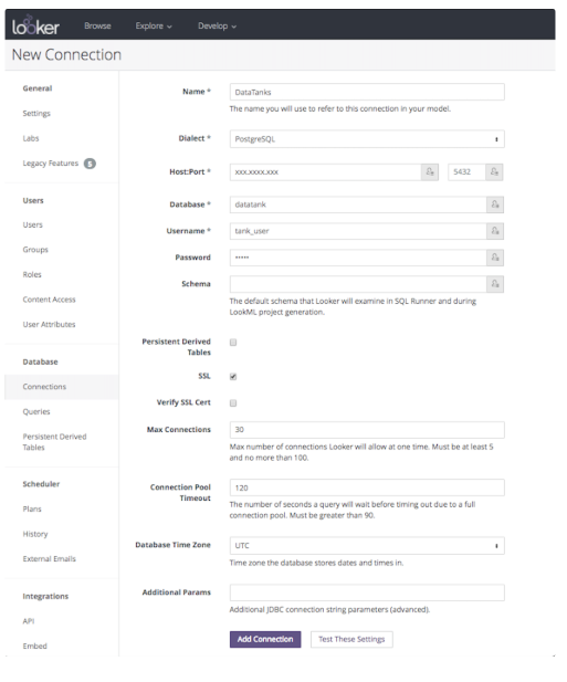 - Enter the Data Tanks’ host and port: xxx.xxx.xxx.xxx:5439