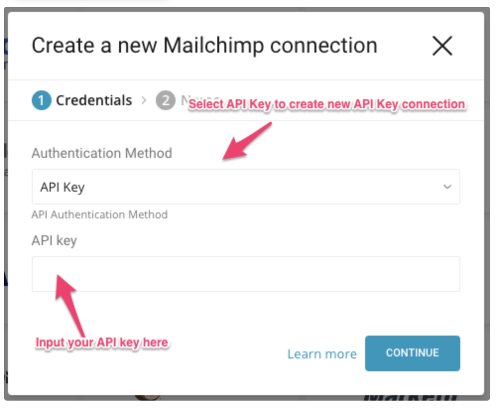 You can specify the MailChimp API Key and credential to authorize Treasure Data access. The API key grants full access to your Mailchimp account.