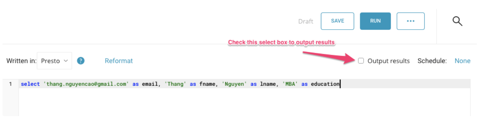 ) tbl (email, first_name, last_name, region, age)The preceding query requires no source table (for the ease of testing out this feature), but you still must choose your database, so pick “sample_datasets” or any other arbitrary table. Also, make sure that Presto is chosen as the SQL dialect.