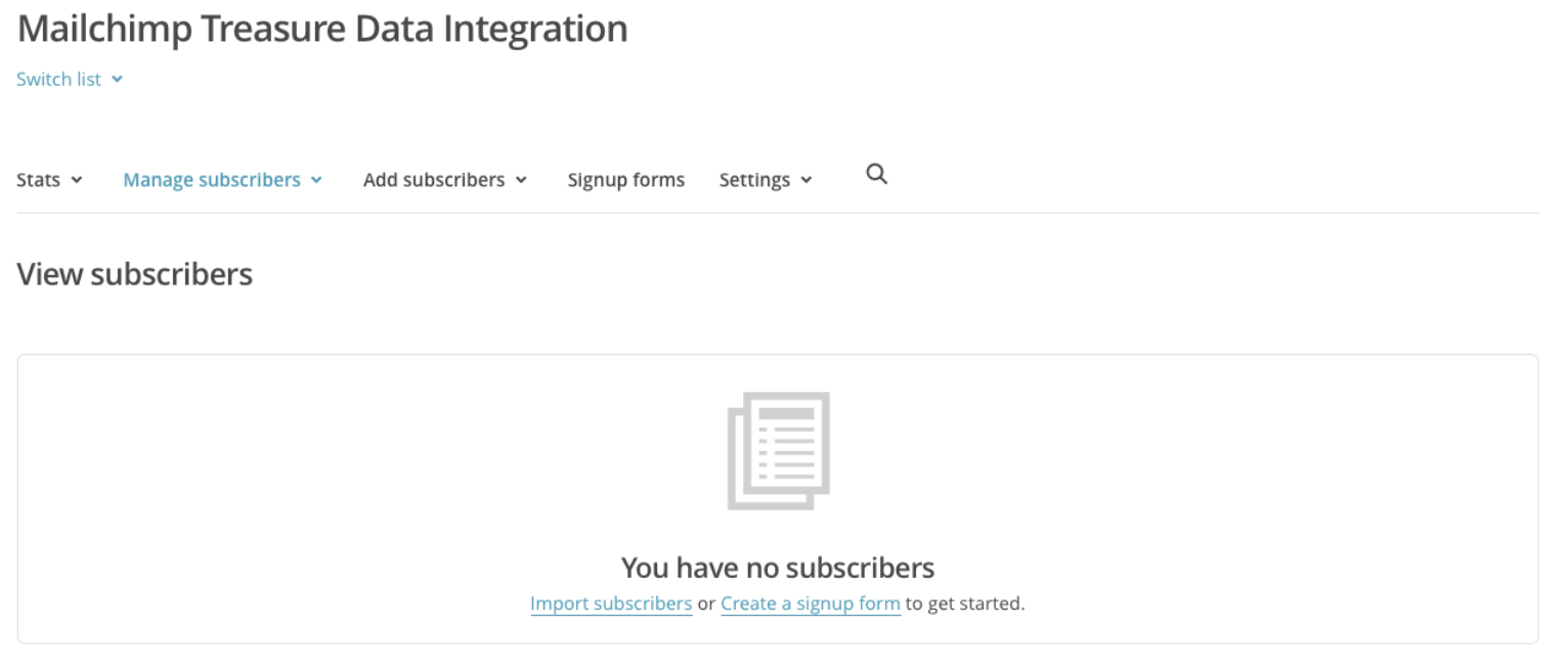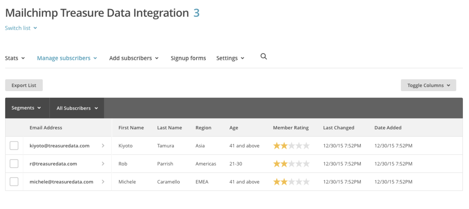 You can create a Mailchimp list from data stored in Treasure Data. Use cases include:
