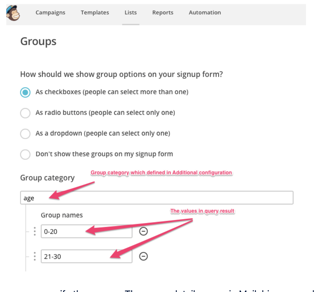 | merge_fields | The values of additional merge fields are used to populate groups in the target MailChimp List. Multiple fields can be configured by separating them by “,”. E.g: WEBSITE,GENDER | |