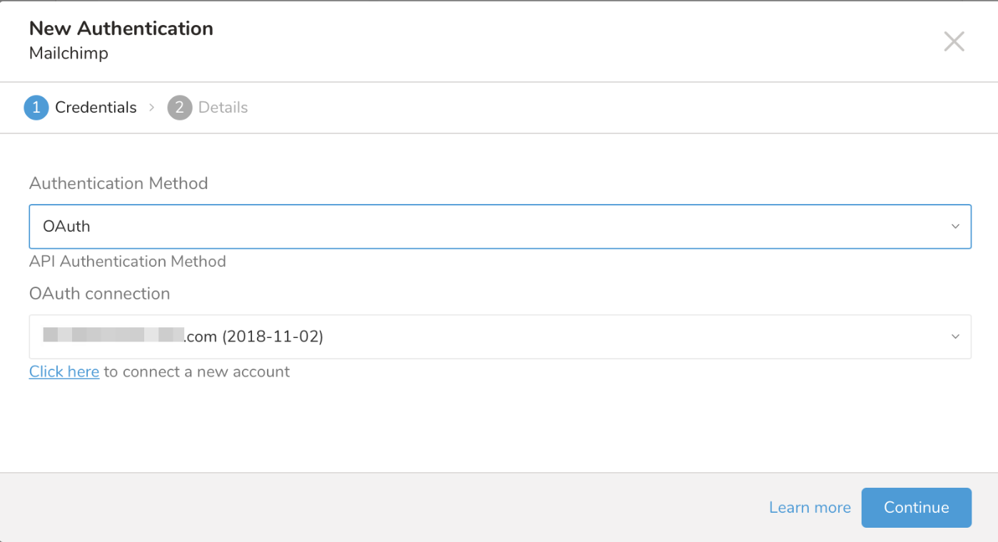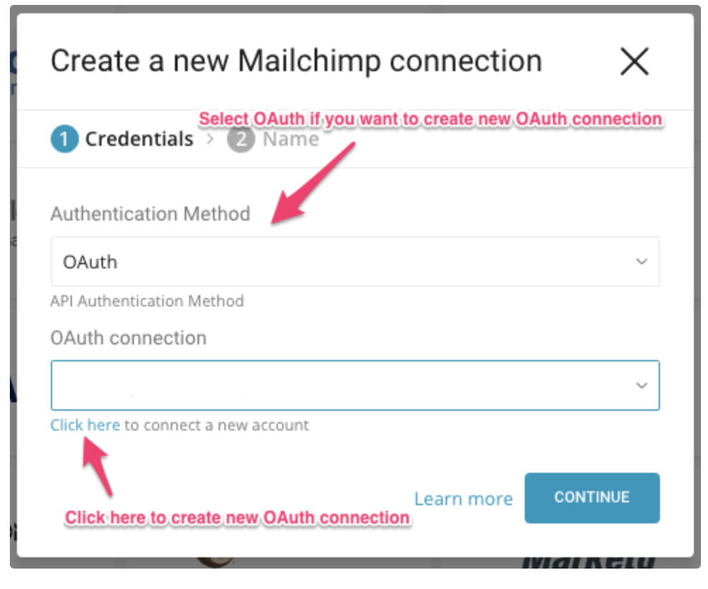 You can select an existing OAuth connection for MailChimp from the drop-down.