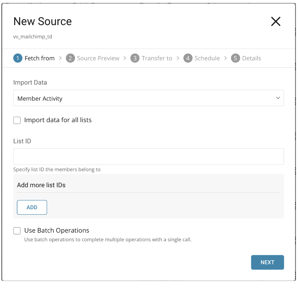 In the New Source dialog, choose Member Activity for the Import Data, and choose whether to import data for all or specific lists, and then select Next.