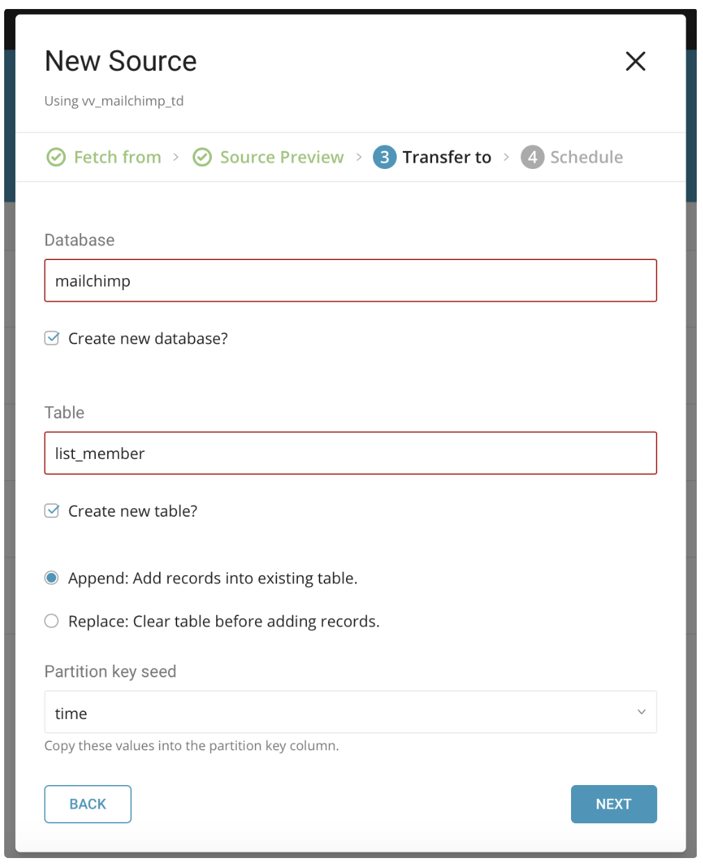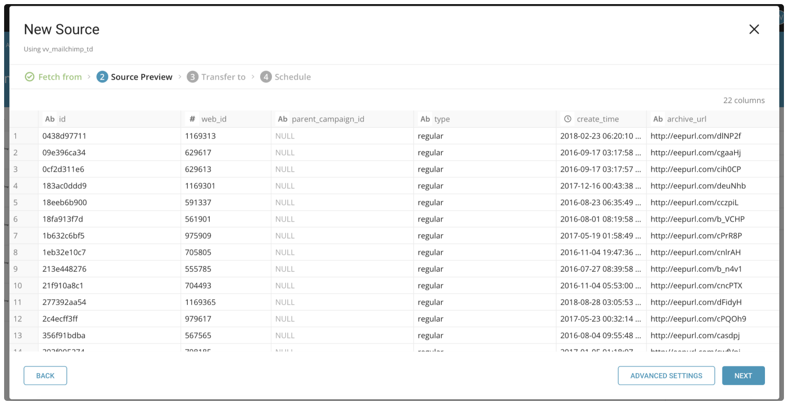 --auto-create-tableYou can schedule periodic data connector execution for periodic MailChimp import. We have configured our scheduler carefully to ensure high availability. By using this feature, you no longer need a cron daemon on your local data center.