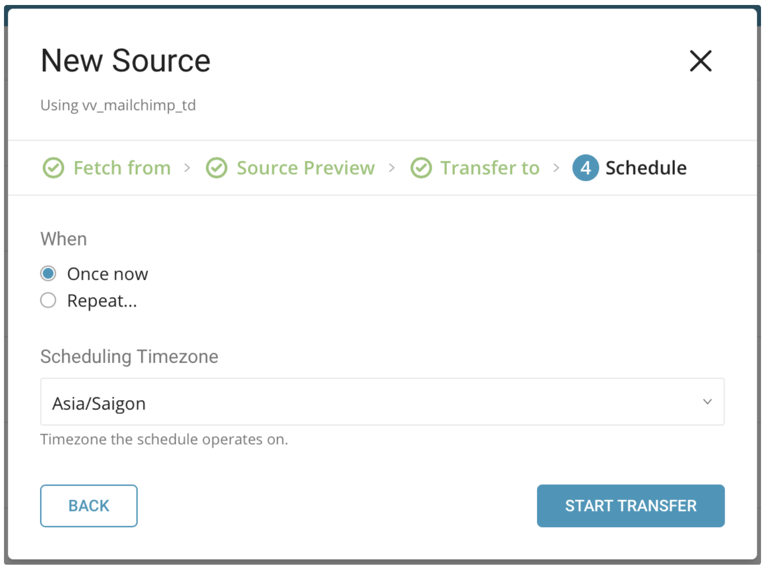 Finally, specify the schedule of the data transfer using the following dialog and select Start Transfer: