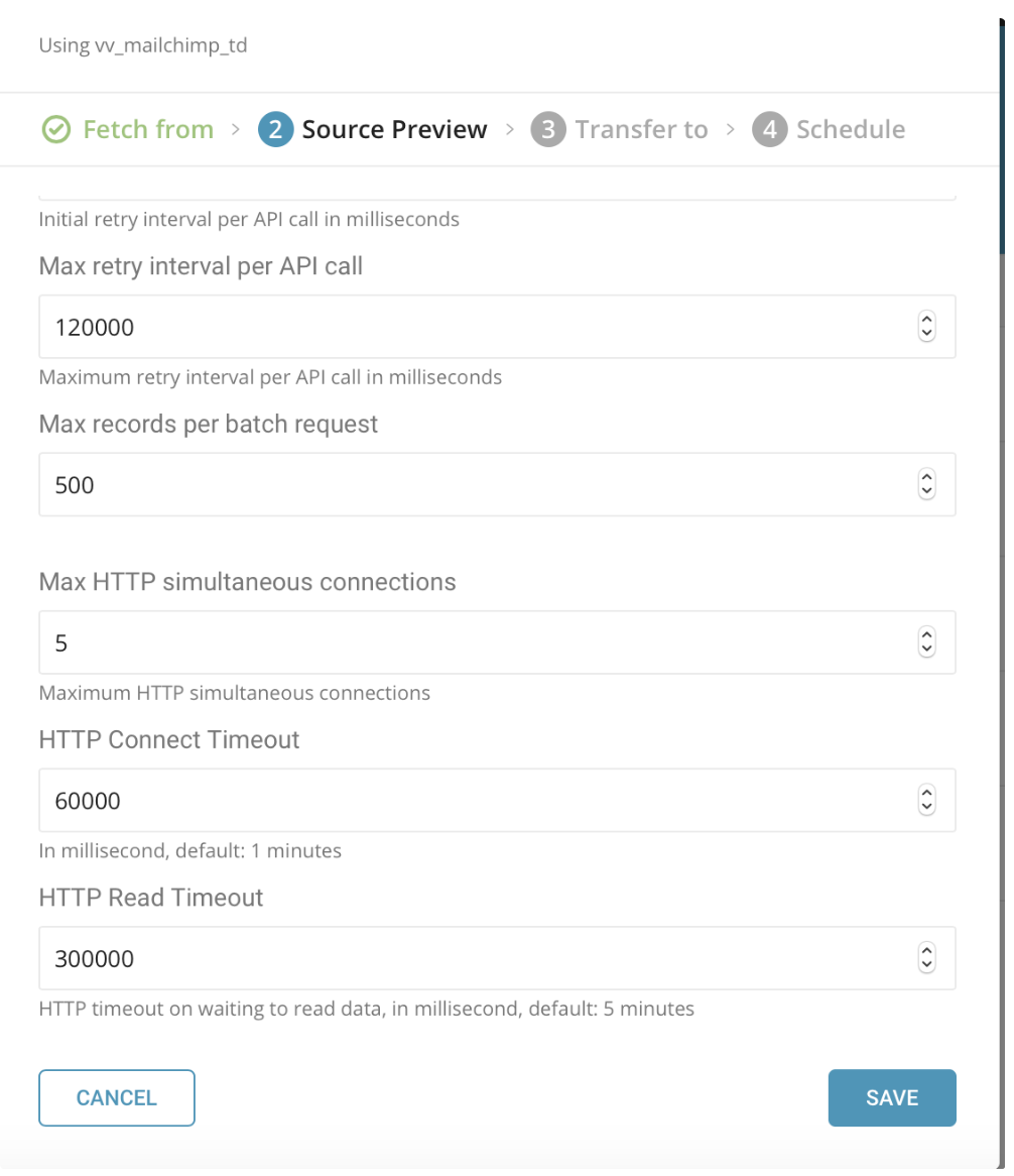 http_max_connections is 5 for running jobs. When running more than 2 jobs at the same time, the parameter value should be reduced to ensure that total of http connections don't exceed MailChimp's rate limit of 10 connections.