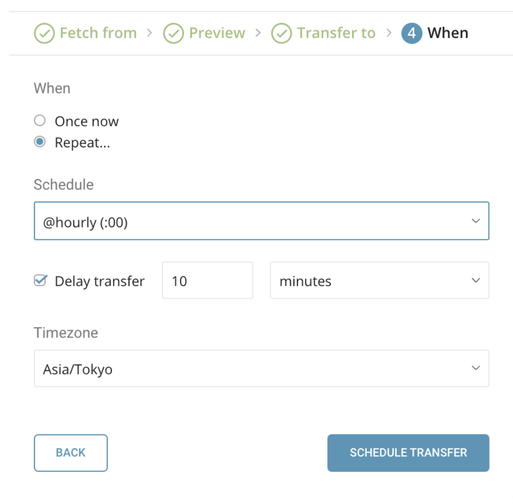 @hourly,@dailyand@monthlyand customcron. - Delay Transfer: add a delay of execution time.